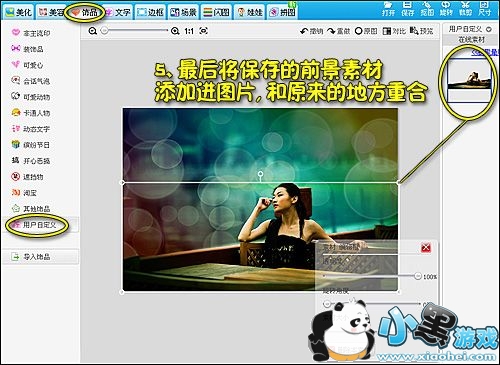 5、最后将之前保存为前景素材的人物,在饰品标签下“用户自定义”中将其添加进图片中,如图7所示,大小位置和原图的完全重合即可。