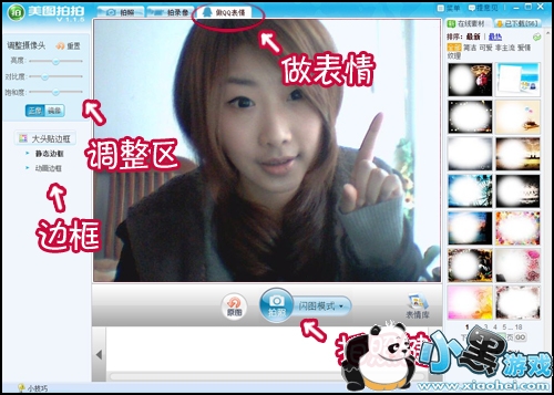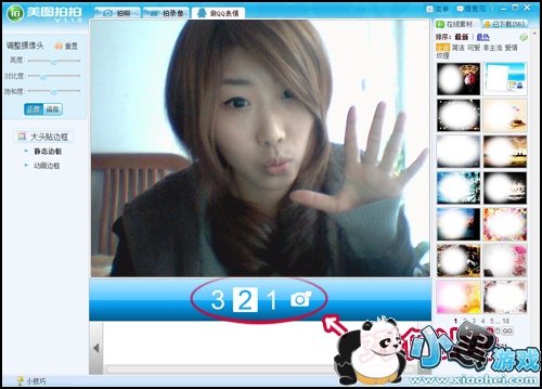 下载好软件之后,打开美图拍拍,点击“做QQ表情”模式。左侧是调整区,可以调节光线亮度、对比度等参数,帮助成像更清晰。下方有大头贴边框类型选择,大家也可以选择要加边框或者不加边框都行哦。准备好之后,点下“拍照”键就能直接开始摆POSE啦。