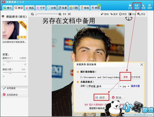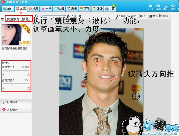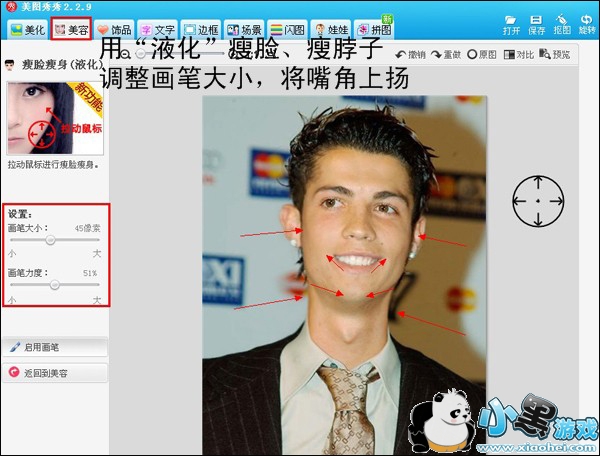 首先用美图秀秀打开C罗的照片后,进入“美容”菜单下的“瘦脸瘦身”功能,调整画笔大小和力度,朝着箭头所指的方向拖动鼠标。瘦脸、瘦脖子,拉嘴角都可以按照大家的想象去发挥。