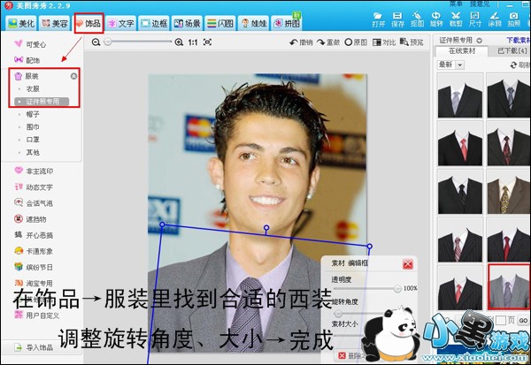 最后给他换上另外一套西服,在“饰品”——“服装”——“证件照专用”里选一套衣服换上就可以啦。记得调整饰品的角度和大小哦。