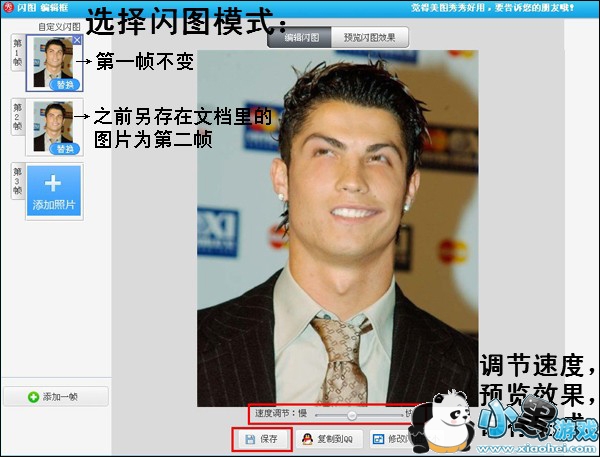 第四步:点击“闪图”菜单下的“自己做闪图”功能,在编辑框里添加第二步保存的那张图片,再预览一下效果,就能看到有趣的挑眉动作啦。记得最后要保存哦!