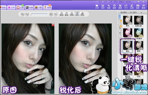 通常经过降噪处理后,会让原本就不清晰的手机照变得更加模糊。这时候对照片进行锐化处理就再适合不过了。使用“图片处理”标签下的“锐化”特效,一键即可提高自拍照的清晰度。