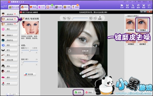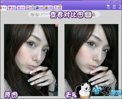 小贴士:根据照片噪点的多少可选择不同程度的一键磨皮功能,一般使用轻度或中度的磨皮去噪即可。去噪之后可以单击“对比”按钮查看处理前后对比图。