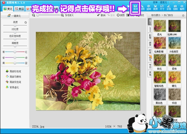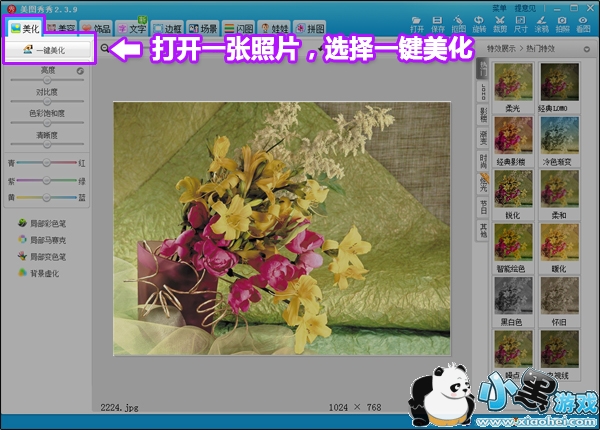 美图秀秀2.3.9版的“一键美化”功能会根据原图的效果,在色彩和明暗度方面对图片的亮度、对比度和色彩参数等方面进行自动修复。