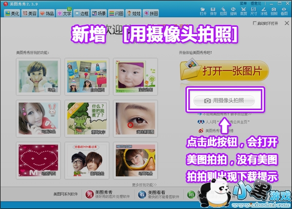 美图秀秀2.3.9新版在软件欢迎页面还增加了“用摄像头拍照”的功能,点击“用摄像头拍照”按钮,会打开“美图拍拍”软件,美图拍拍丰富的边框、特效素材一定能满足MM们拍照的乐趣。如果没有美图拍拍软件的同学们点击按钮后则会提示下载。