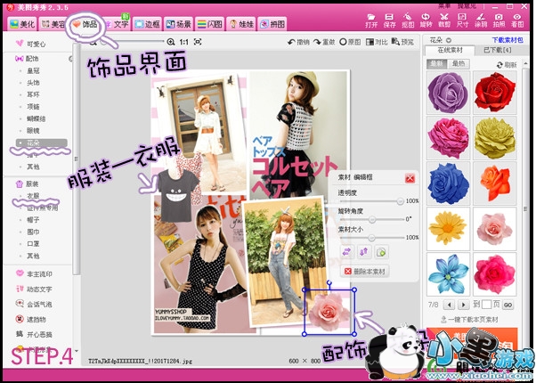第四步:拼好图后再到“饰品”菜单中添加喜欢的饰品,比如衣服、花朵等。