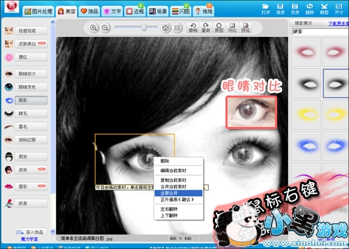 5、继续在“美容”标签下添加眼影。选择黑色酷酷的眼影。同样要对眼影饰品进行必要的调节,使之贴合眼睛。