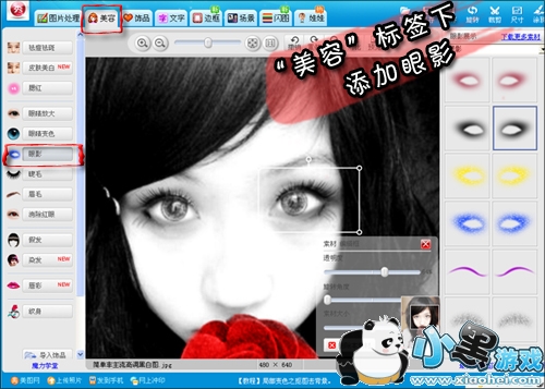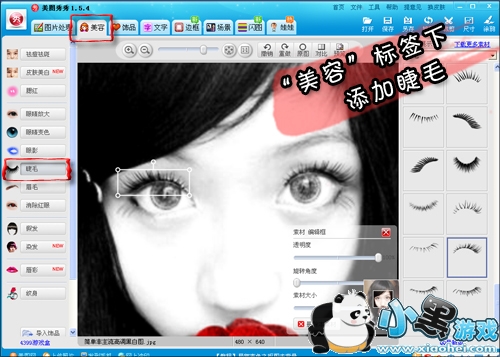 4、为让这个MM整体效果更符合这个黑白效果。接下来可以给MM打造烟熏妆。在“美容”标签下选择添加睫毛。适当调节大小、角度、透明度来让效果更加逼真自然。
