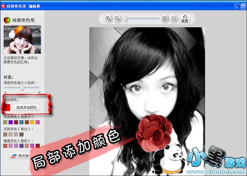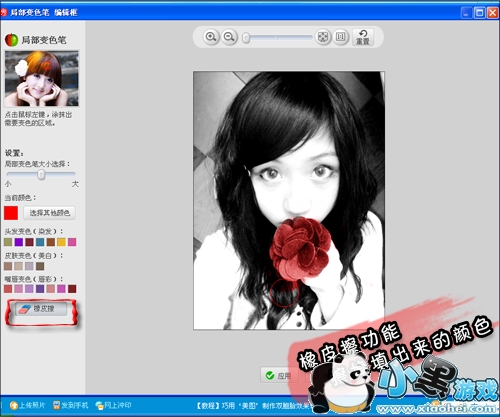 2、然后选择界面左下方“局部变色笔”功能,选择好颜色及其画笔大小,将花朵重新涂色。