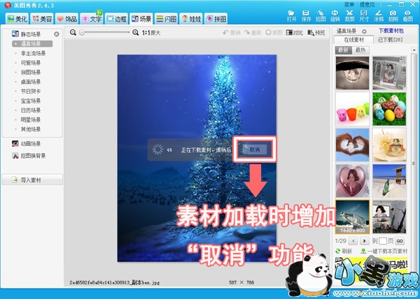 在新版的美图秀秀场景中,增加了一个“取消”功能按钮,让用户在网速过慢加载不成功时,可以关闭选项。