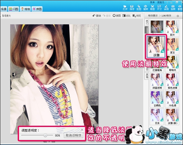 2、再对照片使用LOMO“淡雅”特效,并适当调整特效透明度,让照片色调变得更独特更时尚。如图3所示。当然,童鞋们也可根据自己的喜好添加其他的漂亮特效!