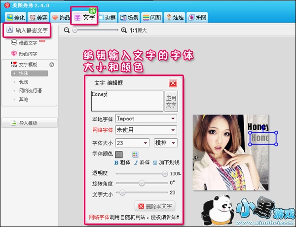 4、裁剪完成后,可以去“文字”菜单下,给头像添加一些自己喜欢的文字。如图5所示。当然可以选择一些饰品素材点缀图片。