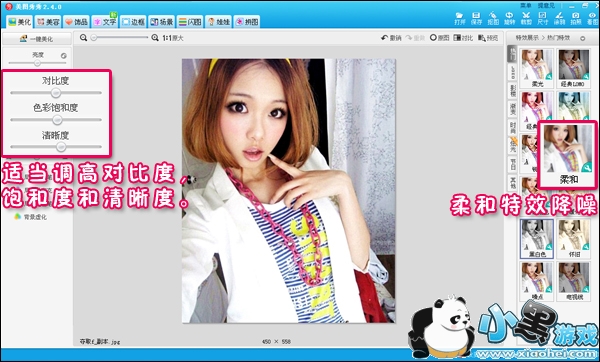 1、在软件中打开一张自拍照。原照的质量如果不是太好,可以在“美化”菜单下,适当调高照片的清晰度和色彩饱和度,并用“柔和”特效做些降噪处理。如图2所示。
