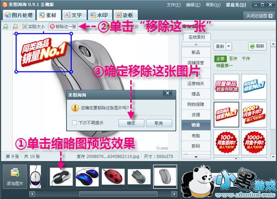 第三步:移除单张图片。为图片批量加上素材后,可以单击窗口下方的缩略图一张张预览,如果发现某张图片不适合用当前素材,可以单击窗口左上角或缩略图上的“移除这一张”按钮(如图3),将该图片移除。