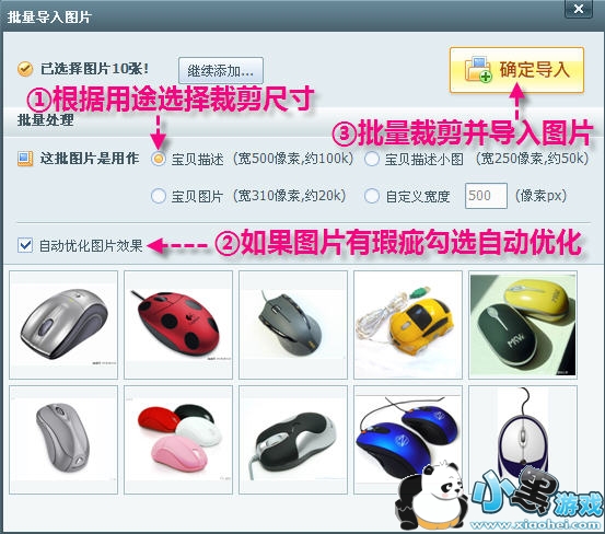 第一步:批量导入图片。运行美图淘淘,单击“批量导入图片”按钮,选中需要的图片,单击“打开”,勾选裁剪尺寸,单击“确定导入”按钮(如图1),批量导入图片。