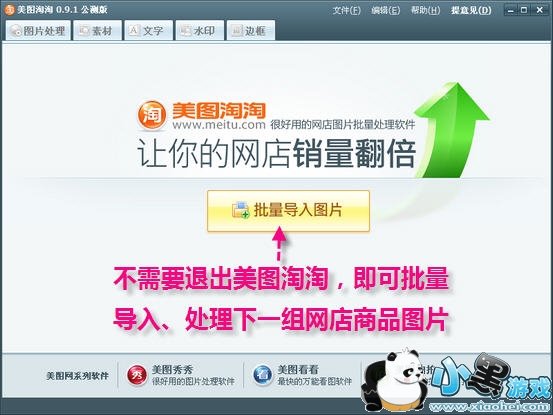 第五步:处理下组图片。完成一组图片处理后,不必要退出美图淘淘,直接单击窗口右上角“关闭这组图”按钮,返回美图淘淘初始窗口,单击“批量导入图片”按钮(如图4),批量导入下一组网店图片继续处理。