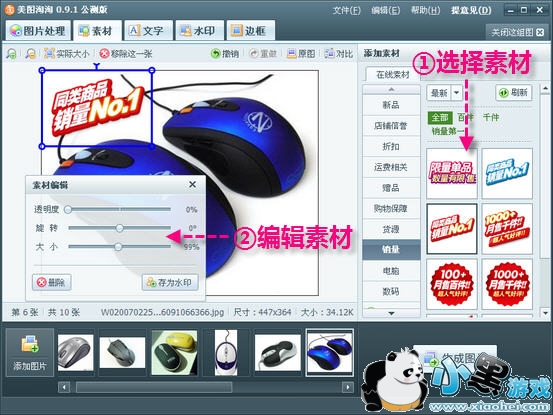 第二步:快速添加素材。切换到“素材”窗口,找到并单击素材效果缩略图,素材自动叠加到图片上,调整好透明度、旋转角度和大小,为网店图片加上素材(如图2)。