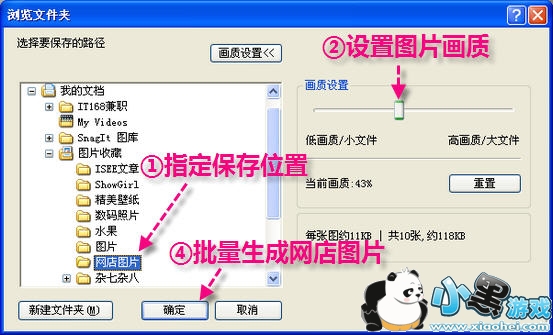 第四步:生成网店图片。单击“生成图片→画质设置”,指定保存路径,拖动滑块设置好画质,单击“确定”按钮(如图4),批量生成网店图片,完成一组图片处理。