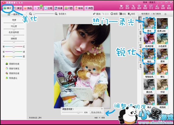 4、为了让亮彩的效果自然一些,在“美化”菜单下,执行“柔光”和“锐化”的特效,并适当地调节一下特效的透明度,如图6所示。