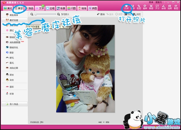 1、用“美图秀秀”软件打开一张偏暗的照片,可能灰暗的照片都会有些噪点问题,可以进入“美容”菜单下用“磨皮去痘”功能降噪,如图3所示。