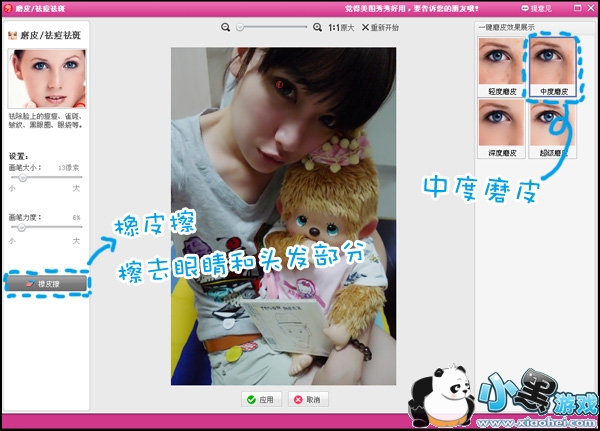 2、在“磨皮祛痘”功能界面下,执行一键“中度磨皮”,就能去除噪点。再用“橡皮擦”功能擦眼睛和头发部分,保留细节的清晰,如图4所示。