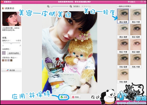3、然后再在进入“美白”功能界面下,选择手动美白,如图5所示的颜色,设置好画笔大小后,即可对照片涂沫来改善偏暗的问题。