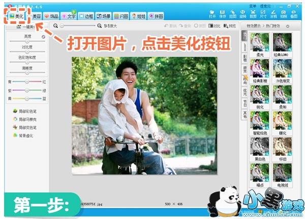 1、用“美图秀秀”打开一张要处理的照片,点击“美化”菜单。