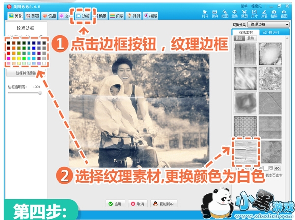 4、接下来进入“边框”菜单下的“纹理边框”分类,选择一个类似折纸的素材效果,并将边框颜色换成白色,制造做旧的感觉。