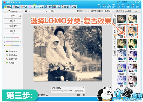 3、借着应用“LOMO”分类中的“复古”特效,让照片呈现出古老的黄色调。注意,这里可以视照片效果调节特效透明度哦。