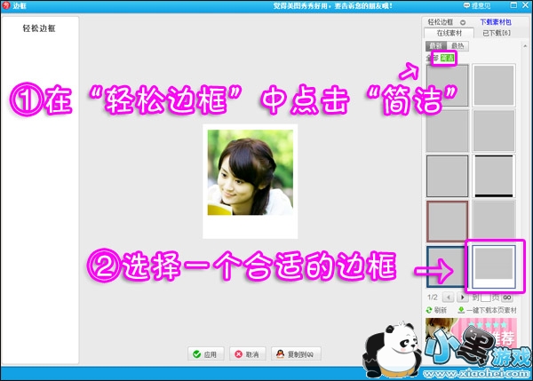 3、裁剪完后,进入“边框”菜单下选择“轻松边框”分类,点击“简洁”,选择一个“拍立得”效果的边框素材。
