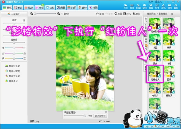 1、首先在软件中打开待处理的照片,在“美化”菜单下选择“影楼特效”,执行“红粉佳人”一次,让照片更加亮丽。