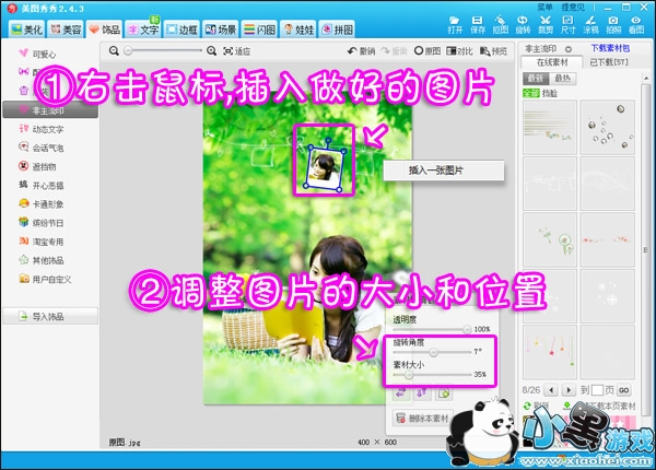 6、单击鼠标右键,选择“插入一张图片”,将刚才做好的素材导入,调整大小和位置就可以啦。