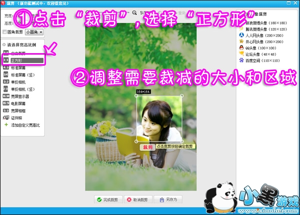 2、点击软件右上侧的“裁剪”按钮,跳转到剪裁界面后,选择“正方形”的宽高比例,调整需要裁减的大小和区域。