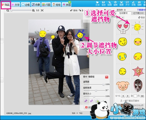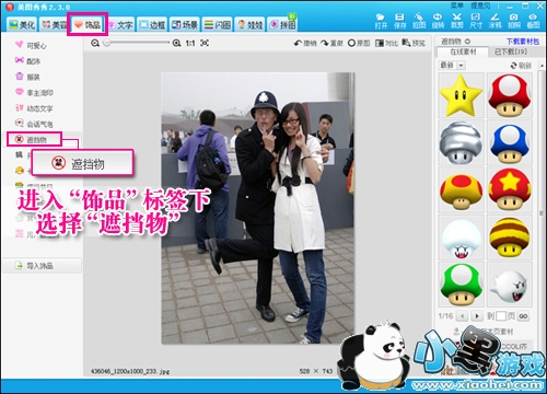 在美图秀秀的“饰品”菜单下点击“遮挡物”分类,然后选择喜欢的饰品把不小心入境的路人挡住就行啦,非常简单。