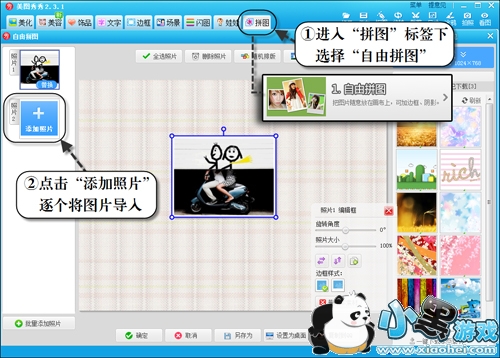 另外还有一种方法可以搞定图片合成,利用美图秀秀的“自由拼图”功能,将照片一起添加在一个画布中。