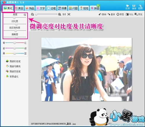 首先,在美图秀秀的“美化”菜单下进行亮度、对比度等细节参数调节。