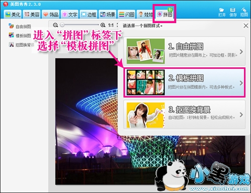 如图1的图片合成制作只需2步:先进入美图秀秀软件的“模板拼图”菜单。
