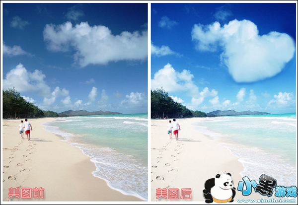 想拍到无比满意的美照可不是易事,看自己平时拍的照片大部分是“鸡肋”,咋一看还OK,但仔细瞧也实在不出彩。其实,只要耍点小创意,给鸡肋照片做点“艺术化”的后期处理,就会有让人眼前一亮的感觉哦!比如小编这张用“美图秀秀”新P的图片,简单的调色再加上液化的妙用,平庸的照片就大放异彩了呢! 图1唯美的色调和创意的“心形云”是不是很浪漫呢?下面就来跟大家分享详细的P图步骤吧。1、在软件下打开原图,在“美化”菜单下,点击使用“智能绘色”特效,并适当地调高亮度和对比度,让黯淡照片立刻鲜亮起来。 图22、可看起来,天空的颜色还不够蔚蓝。别着急,我们可以使用“局部变色笔”功能,选择“蓝色”和适当的画笔大小对天空进行涂抹上色。 图33、但是过于鲜艳的颜色会让照片失去一些意境,这时我们可以在“LOMO”特效里选择 “淡雅”特效,并将其透明度调低一点,可以增添色调的时尚感。 图44、简单3步过后照片色调已经OK啦!下面就是打造“心形云”的重头戏咯。首先进入“饰品”菜单下,点击“非主流印”,找到云朵素材并添加进图片,记得要鼠标右键“合并当前素材”。 图55、接着在“美容”菜单下使用“瘦脸瘦身(液化)功能”,调节适当的画笔力度和大小,去拖拽云朵的边缘来修改云朵的形状,使之变成“心”形状。 图6小贴士:液化变形后,云朵的边缘可能看起来有些生硬,这时可以使用“美容”菜单下的“磨皮祛痘”功能局部涂抹云朵边缘,可以改善不自然的情况哦。6、最后再给照片添加一些其他云朵,并在“文字”菜单下,使用“静态输入文字”功能输入文字,就大功告成啦! 图7如果照片本身就有现成的云朵,直接“液化”成心形就更简单啦! 图8液化的创意妙用还不止如此呢,我们还可以用同样的方法将圆月、光束等自然景观打造成浪漫的“桃心”哦!事实证明,只要动点小脑筋就能做出独特的艺术效果。小编也期待大家有更多P图的创意,做出更多更好的个性照片哦!赶快动手去试一试吧!