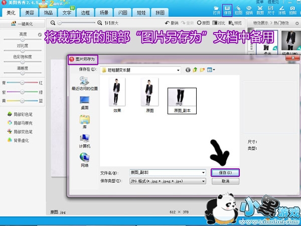 第五步:再次点击鼠标右键“插入一张图片”,将之前保存好的腿部图片放进来。覆盖到原图MM的腿部位置,然后将这个腿部图片按比例拉长,待与原图完全吻合后,合并全部素材。