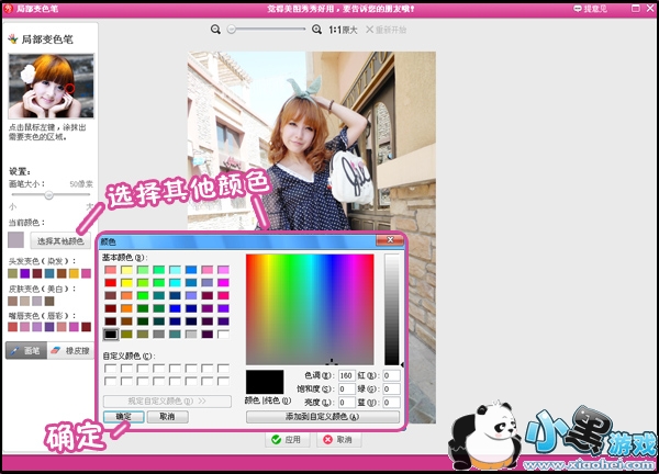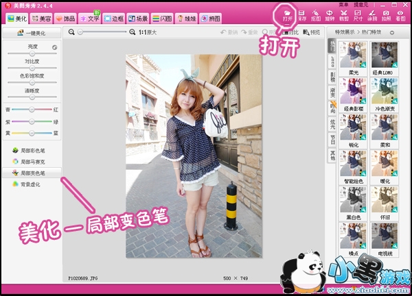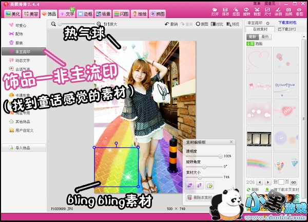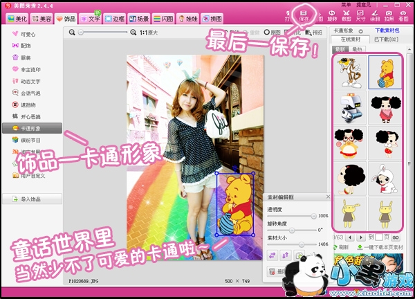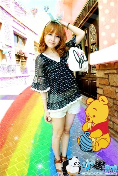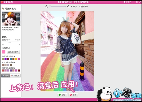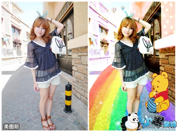 图2“彩虹”的地面呼应着充满童话色调的街道,还有可爱的小熊维尼,非常有趣吧?喜欢的话,马上来学习一下制作方法吧。1、用“美图秀秀”打开一张照片,点击“美化”菜单下的“局部变色笔”功能。 图32、在颜色选择器中选择自己喜欢的颜色,就可以用画笔在相应的地方涂抹。 图43、各部分颜色都上完后,如果效果觉得满意,就可以点击应用了。 图54、为了让整张图片的色调更加接近童话色彩,给图片加个“LOMO—哥特风”,当然可以根据个人喜好调整一下特效的透明度。 图65、然后在“饰品”菜单下,给图片加一些有童话感觉的漂亮饰品,比如闪闪的素材,彩色热气球啊等等。 图76、再找一个卡通形象把碍眼的路障给挡住,比如这里选择的是可爱的小熊维尼,添加后调整好位置大小就可以保存啦1 图8再来看看最终效果吧: 图9好啦,简单几步就可以让自己置身于可爱的“童话世界”中,喜欢童话风格的亲们可要记得试一试哦!这次Yummy教你做美图的教程就结束了,下期会是什么主题呢?敬请期待哦! 图10