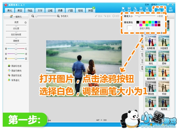 第一步:打开一张要处理的图片,选择“涂鸦”工具,将画笔颜色选为白色,大小调节为1。