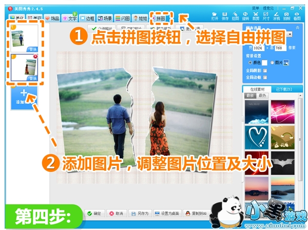 第四步:打开“自由拼图”功能,将刚做好的两张照片添加进来,并摆放到适合的位置。