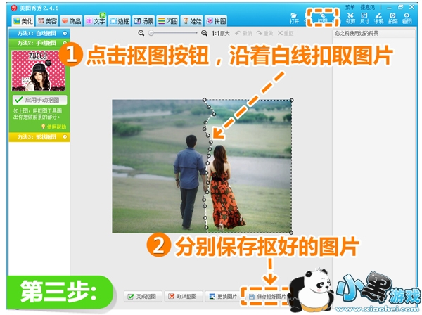 第三步:接着使用“抠图”功能,将左边部分抠下保存;同样方法抠出右边部分保存。