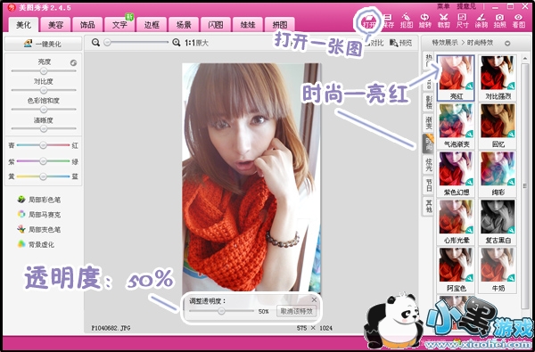 1、打开一张要处理的照片,先在“美化”菜单中选择“亮红”特效,并把透明度调节到50%,先做出淡淡的光晕效果。