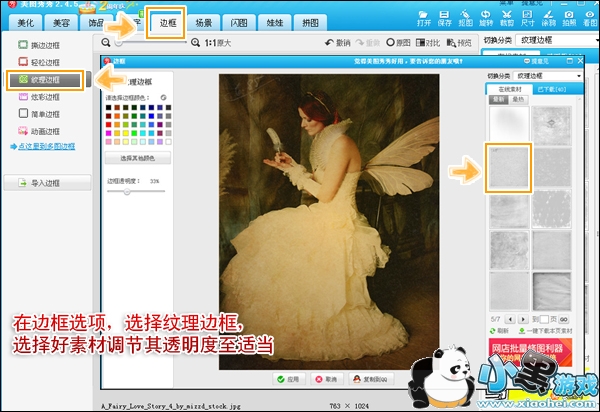 6、为了营造复古的画面感,我们需要为画面增加纹理,在“边框”——“纹理边框”里,找到如下合适的纹理边框,并且适当地调节其透明度,让画面的纹理不至于太突兀。