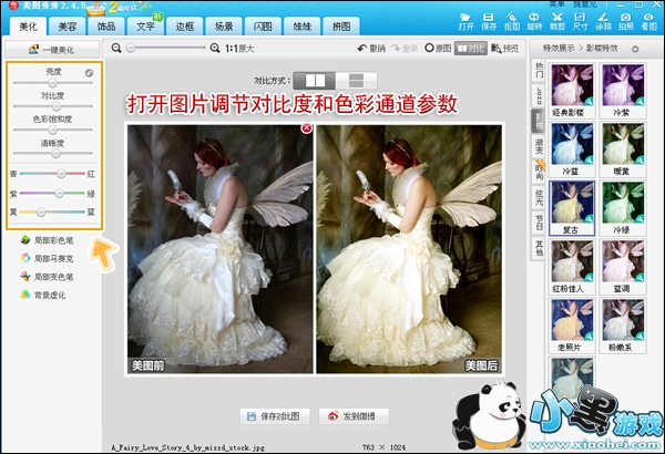 1、首先打开图片,如图2所示,依次调整对比度、清晰度,和色彩通道的参数。要多多尝试,就能很灵活的变动图片的色调。