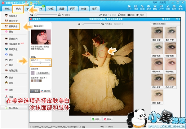 5、我们需要增强“回忆”后的画面感,再次转到“美容”菜单下,选择“皮肤美白”,使用默认颜色涂抹面部和肢体,拉开图片色彩的层次感。