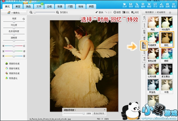 4、再选择“时尚-回忆”特效。这个特效的色彩感很复古,很受P图爱好者的青睐哦!