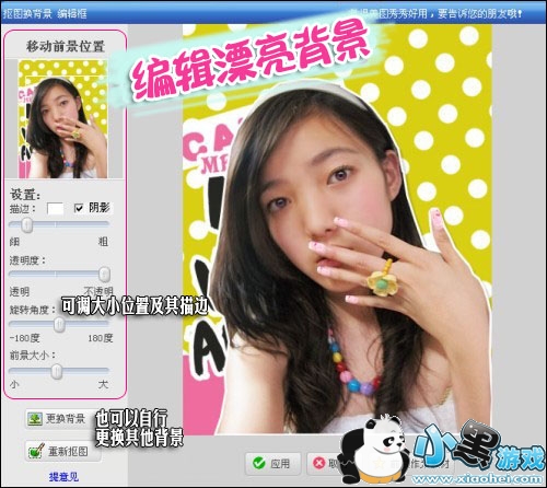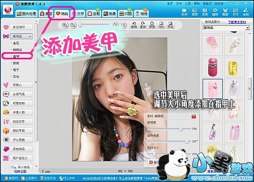 女生都爱折腾自己,不肯放过每一寸肌肤的保养和美化,不过美甲和头饰也是增加靓丽的小秘诀哦,最近发现一个不用去美甲店轻松美甲的办法,就是用“美图秀秀”软件美甲,只要鼠标点点就能打造各种精致美甲哦。看看效果吧: 图1其实处理之前的我,皮肤粗糙灰暗,照片更是暗淡没有特色。 图2看了对比更加惊讶了吧?哈,还有让你觉得神奇的是,这些操作都是在一分钟内完成的哦,只要鼠标点点哦,嘻嘻,睁大眼睛我也开一堂美甲的课,亲们都来捧场啊。启动软件打开图片: 图3第一步:美肤美容想要水水的皮肤,当然要美白,一白遮百丑嘛,轻松美白不惧阳光的暴晒哦。 图4接着对皮肤的细节进行磨皮,消除眼袋和皮肤粗糙问题,简单一摸,皮肤嫩光光! 图5为了让眼睛有神,我再选择个有色眼睛,只要调节一下透明度就有发光的眼睛哦! 图6看看第一步美肤前后对比,变化很大吧? 图7第二步:装饰图片细长的手指当然需要美丽的指甲,“美图秀秀”软件中自带很多指甲样式,挑了半天,觉得这个粉色的碎花样式比较适合MM。 图8调节大小角度后,逐个添加美甲,然后鼠标右键“全部合并”。 图9背景不好看,没关系,抠出人像换个背景。 图10可以加描边和阴影哦,现在的图片处理中非常流行描边,可以适当粗一点。 图11最后加上一个可爱的小蝴蝶结,这样白色头箍上就不再单调啦。 图12这就制作完毕啦,没骗你吧,真是鼠标点点就完成啦。 图13各种美容彩妆搭配时尚小单品,比如指甲、蝴蝶结、帽子、眼镜等,爱美的MM还等啥,赶快下载“美图秀秀”软件尝试一下吧!