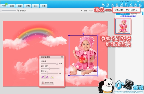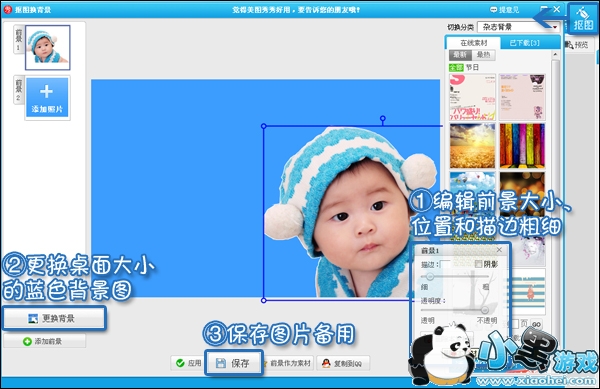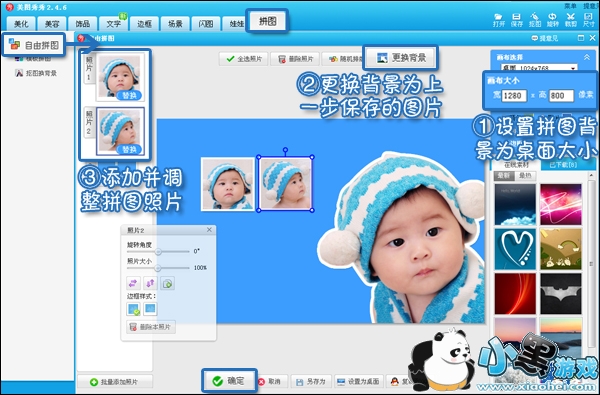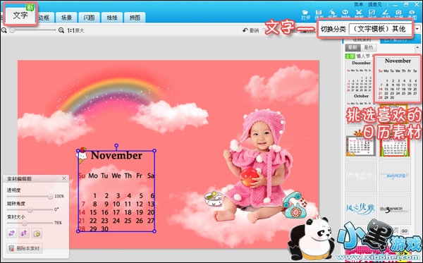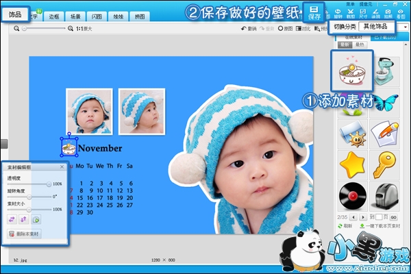 妈妈们都喜欢给宝贝拍照片,就连拍好的照片也想变着法地做些创意,比如做成手机壁纸、QQ头像或者论坛签,甚至电脑桌面也不能放过。但是整张照片作为壁纸总觉得不够好看,要是能把照片适当地美化做成日历壁纸,绝对漂亮又实用哦!今天给潮妈们推荐DIY宝宝日历壁纸的两种实例!制作起来可是超快超简单哦!实例一:粉红梦幻系(抠图+饰品) 图1妈妈们先看看这张粉嫩的壁纸,坐在云端的宝贝是不是很梦幻呢?如果你家也有这样一个甜心女宝宝,一定不要错过这张壁纸的制作方法哦!1、在“美图秀秀”里打开宝宝照片,使用“自动抠图”功能,将宝宝像抠出来后,单击“前景作为素材”,软件将自动将抠好的宝宝前景图片保存到“饰品”菜单下的“用户自定义”中。 图22、另外打开任意一张桌面大小的图片,使用涂鸦笔涂抹成粉红色。进入“饰品”菜单下,在“非主流印”分类中找到彩虹和云朵素材,并添加进图片中。 图33、然后点击“用户自定义”分类下,将刚才作为前景素材的宝宝照片添加在云朵上。 图44、再进入“文字”菜单下,在“文字模板”—“其他”分类里,找到并添加喜欢的日历模板。最后再加上一些可爱的小饰品,满意后保存图片就可以设置为电脑壁纸咯! 图5实例二:粉蓝鬼马系(抠图+拼图+饰品) 图6壁纸要是做得太花哨不但衬托不出宝宝的可爱,还会让桌面显得很乱。而这张简洁大方的粉蓝壁纸,是不是让宝宝的鬼马表情更加突出呢?1、打开宝宝照片同样先进行抠图操作。然后在“抠图换背景”窗口给抠好的照片换上桌面大小的蓝色背景并保存备用。 图7小贴士:桌面大小的纯色蓝背景图可以自己动手做哦,只要将一张大图“裁剪”成桌面大小,并用蓝色“涂鸦笔”就能涂抹成纯色背景图哇!2、再打开另外一张宝宝照片,单击“自由拼图”。将拼图背景换成上一步保存的图片。然后妈妈们可以随自己的喜好多添加几张宝贝照片哦! 图83、完成拼图后再用同样的方法添加上日历模板和一些小饰品,简洁的粉蓝壁纸就完成啦!制作时妈妈们要注意左边预留些空挡放电脑图标哦,不要让电脑图标把美照给挡住啦! 图9以上两个实例仅供妈妈们参考,其实“美图秀秀”软件里还有很多素材适合用来做宝宝壁纸,潮妈们只要多多尝试,一定能做出更多有创意的日历壁纸。制作过程不但能体验DIY的乐趣,看着电脑桌面换上了自制的可爱宝宝壁纸,也肯定小有成就感吧,哈哈!